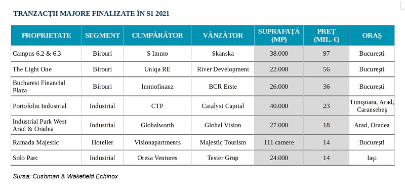 Cele mai importante trei tranzacții din primul semestru au fost parafate de investitori din Austria care s-au extins pe piața birourilor din București prin achiziția imobilelor Campus 6.2 & 6.3 (S Immo), The Light One (Uniqa RE) și Bucharest Financial Plaza (Immofinanz). Cele trei tranzacții, cu o valoare cumulată de circa 189 de milioane de euro, reprezintă o cotă de 63% din volumul tranzacționat în prima jumătate a anului.