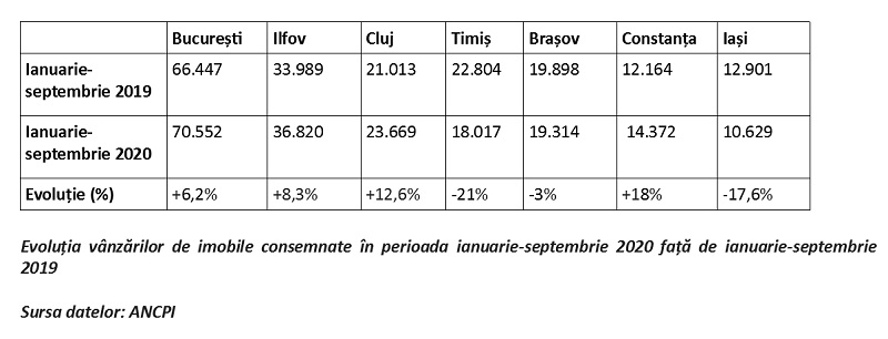 În județul din sud-estul țării au fost vândute, în septembrie 2020, 1.806 imobile, în creștere cu 25% față de luna anterioară (când au fost încheiate 1.444 de acorduri de vânzare) și, respectiv, cu 52,5% comparativ cu perioada similară a anului trecut (când au fost înregistrate 1.184 de contracte). În primele nouă luni din 2020, numărul proprietăților achiziționate în județul Constanța a ajuns la 14.372, ceea ce reprezintă un plus de circa 18% față de aceeași perioadă a anului anterior (când au fost tranzacționate 12.164 de imobile).