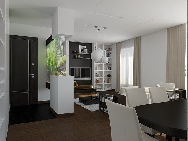 Amenajat pentru un cuplu cu un copil, apartamentul din imagini este situat în Moscova, Rusia, și dispune de o suprafață de 83 de metri pătrați. Potrivit designerilor, ideea din spatele acestui proiect a fost aceea de a utiliza într-un mod rațional suprafața locativă avută la dispoziție – un bun scump în capitala Rusiei. Pentru a pune cât mai bine în valoare spațiul locuinței, beneficiarii proiectului au optat pentru o compartimentare modernă, cu living deschis, ce comunică cu zona de dining și bucătăria.