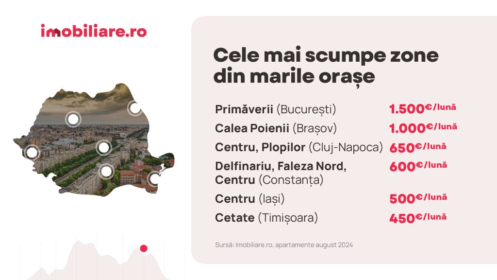 1.Există patru zone în România unde plătești, în medie, cel puțin 1.000 euro/lună pentru închirierea unui apartament. Așa cum era de așteptat, trei dintre ele se află în Capitală. O surpriză vine, însă, din Brașov, oraș care depășește Cluj-Napoca și întregește lista. Cea mai scumpă zonă de pe piața închirierilor din Brașov este Calea Poienii.