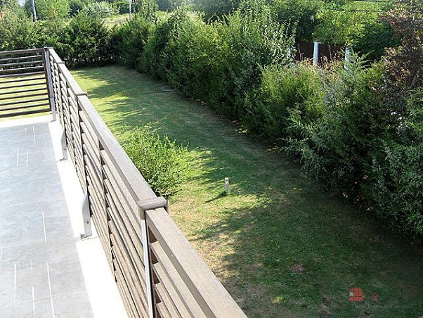 Proprietatea se încadrează perfect în cadrul natural exterior, marcat de apropierea pădurii. Amplasamentul deosebit este pus în valoare prin orientarea spre sud a casei și prin suprafețele vitrate ample, ce înlocuiesc pereții exteriori ai livingului spațios (de circa 70 de metri pătrați) de la parter. Pentru amenajarea interioară sunt preferate materialele naturale, precum lemnul sau piatra de calcar. La nivel cromatic, arhitecții optează pentru o combinație elegantă de alb, crem, maro închis și negru – aceasta se regăsește, în diverse forme, în toate încăperile casei. Parterul capătă un aer grandios datorită înălțimii și stâlpilor aparenți din marmură, efectul fiind amplificat de corpurile de iluminat din sticlă de Murano.
