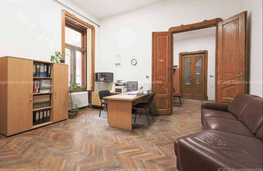 În cadrul acestui monument istoric, o oportunitate rară este listată pe platforma Imobiliare.ro pentru cei care își doresc să locuiască sau să-și desfășoare activitatea profesională într-un spațiu cu adevărat special: un apartament amplasat la parterul înalt al clădirii este acum scos la vânzare, la prețul de 210.000 euro.
