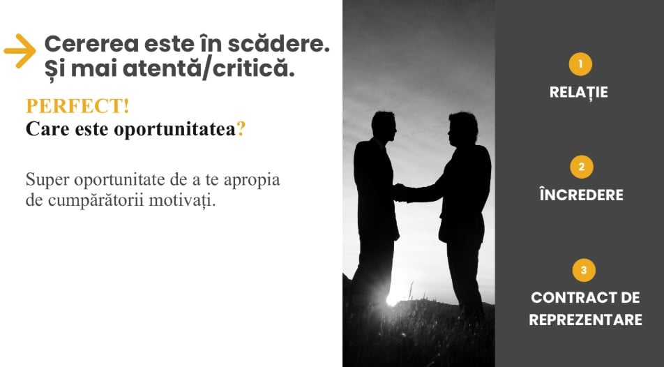 Clientul nu se mai hotărăște atât de repede, este puțin în defensivă. Dacă înainte reacționa impulsiv pentru că totul era în creștere, acum cumpărătorul este în defensivă. Analizează mai mult și mult mai atent ce se întâmplă în piață, din toate punctele de vedere.