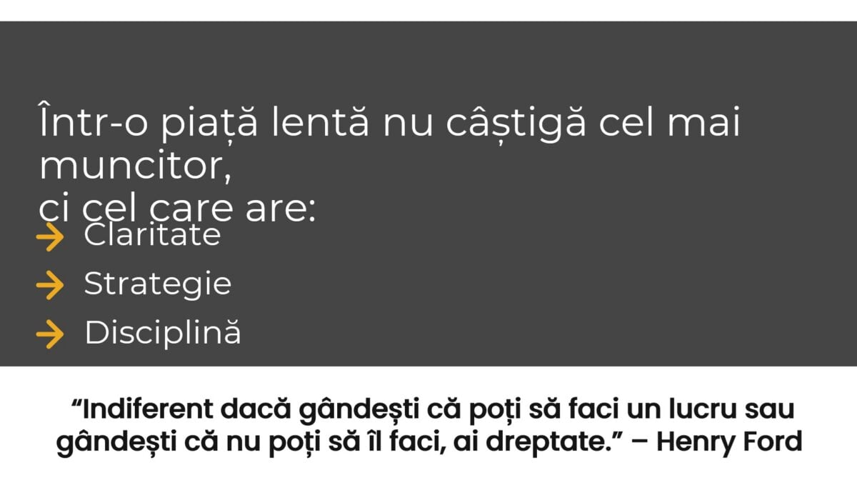 David Grigorescu este de părere că într-o piață lentă câștigă acei jucători care reușesc să anticipeze tendințe și dau dovadă de o capacitate bună de adaptare. Într-o piață lentă nu câștigă cel mai muncitor, ci cel care beneficiază de claritate, strategie și disciplină.