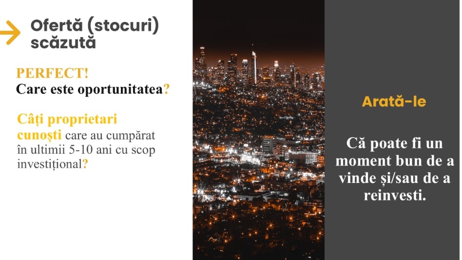 - Când pe piață există stocuri scăzute poți să te gândești câți proprietari cunoști care au cumpărat în ultimii 5-10 ani o locuință cu scop investițional și să le arăți de ce ar fi un moment bun să vândă și poate chiar să reinvestească banii tot în imobiliare.