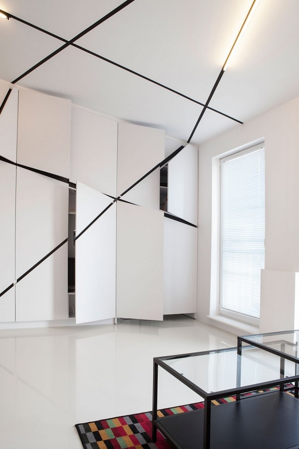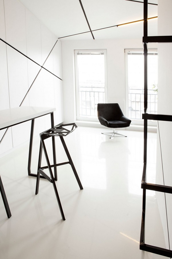 Designerii optează pentru „îmbrăcarea” casei într-un fundal complet alb – din tavan până în podea; în combinație cu lumina naturală ce pătrunde din abundență prin cele trei ferestre/uși, acesta contribuie la „dilatarea” optică a spațiului disponibil, prin estomparea delimitărilor sale naturale. Pentru a aduce varietate și contrast în decor, autorii proiectului brăzdează „masa” de alb cu ajutorul câtorva linii frânte negre – pe alocuri, acestea par să se „materializeze” sub forma scaunelor de bucătărie sau a scării metalice. Antiteza alb-negru, specifică curentului minimalist, este conturată și cu ajutorul celor câteva piese de mobilier alese (sofaua, măsuța de cafea, scaunul rotativ), în vreme ce covorul aduce în „peisaj” câteva – necesare – accente de culoare.