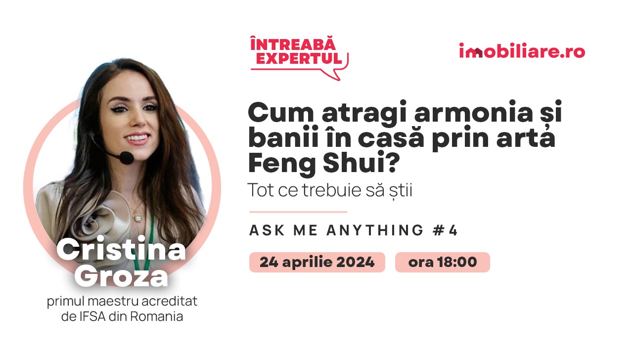 Cristina Groza, primul maestru acreditat de Asociația Internațională de Feng Shui (IFSA) în România și unul dintre cei patru maeștri Feng Shui acreditați din Europa, va fi alături de noi pe 24 aprilie și ne va învăța cum să ne amenajăm potrivit locuința și ce trebuie să verificăm atunci când vrem să ne cumpărăm o proprietate sau să ne mutăm cu chirie pentru a ne asigura că facem cele mai bune alegeri pentru noi și familiile noastre. Găsești aici mai multe detalii despre subiectele pe care le vom dezbate împreună.