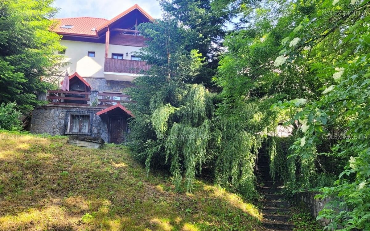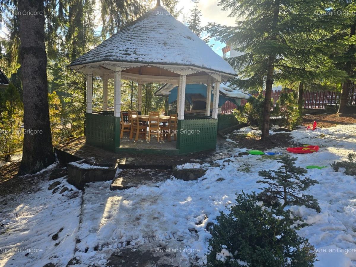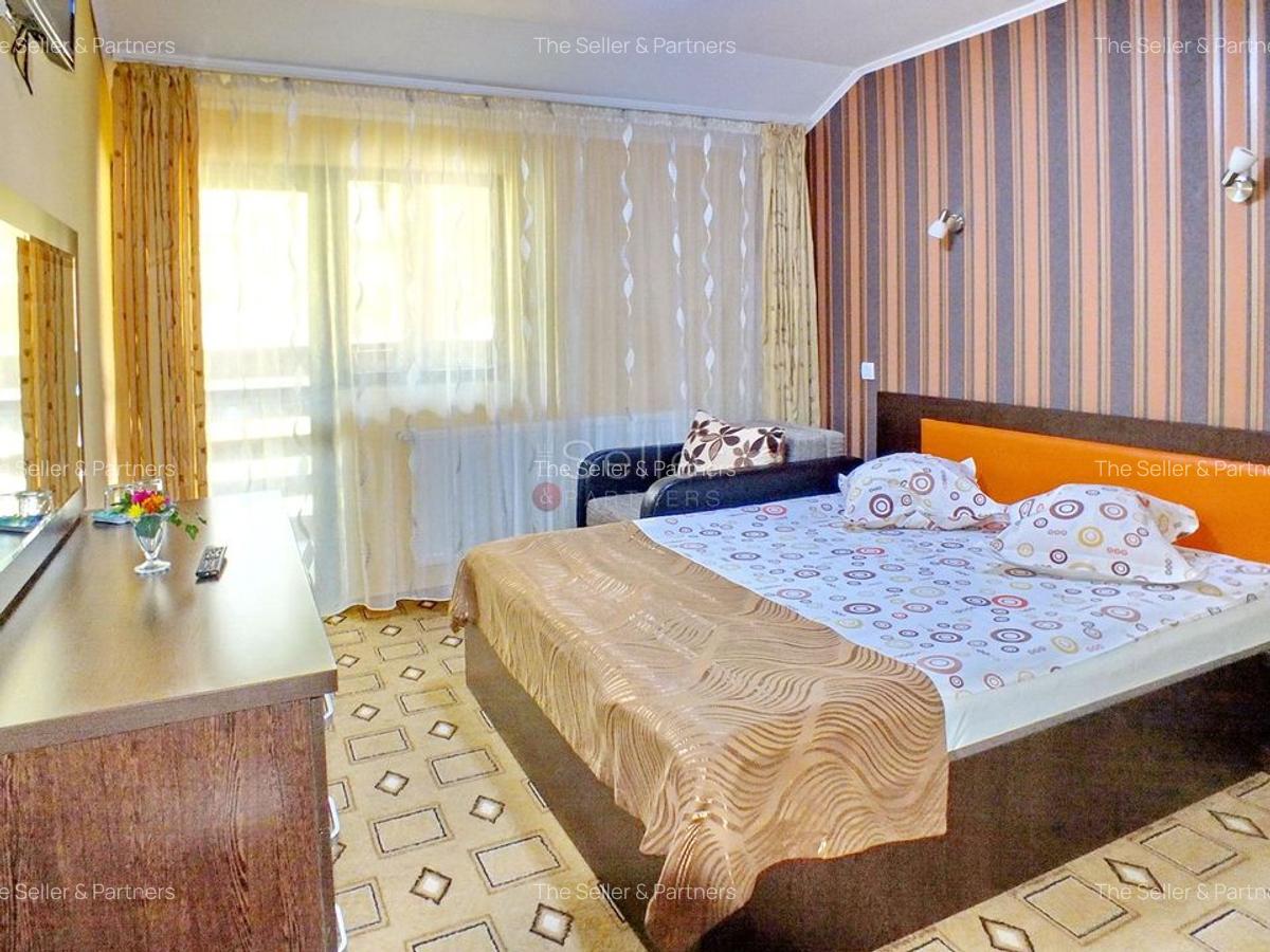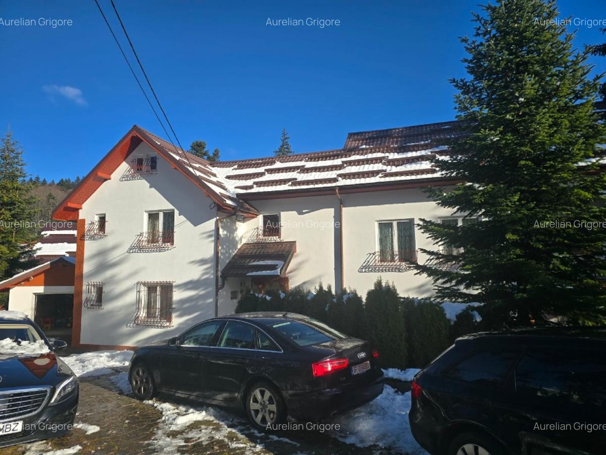 Clădirea include 13 camere cu băi proprii, multe dintre ele cu balcoane și priveliști fie către stațiune, fie către pădure, potrivit anunțului de vânzare publicat pe Imobiliare.ro.