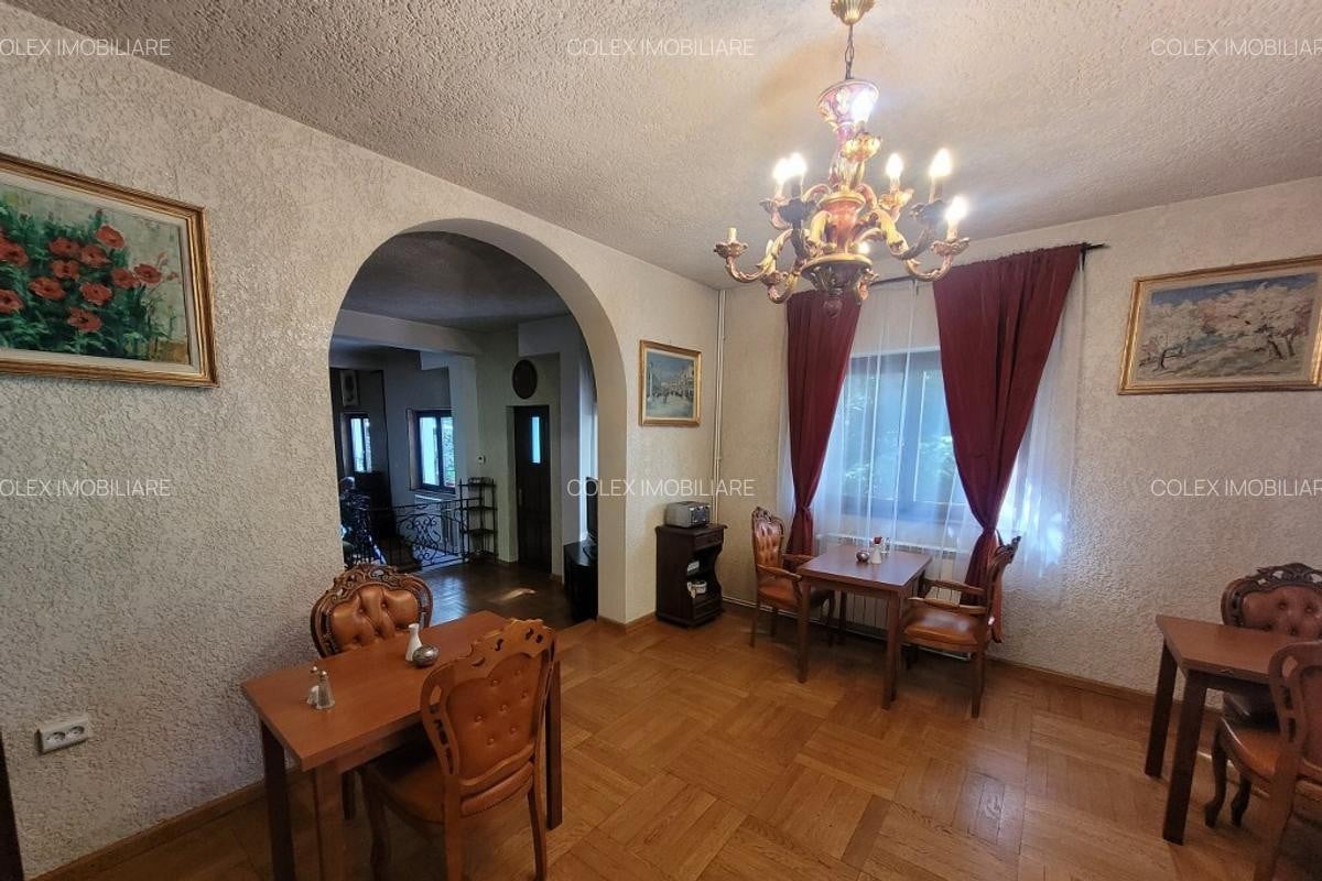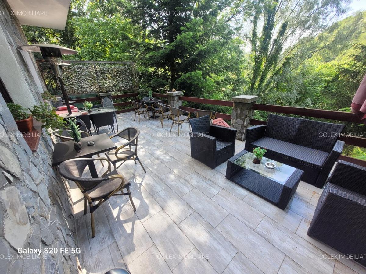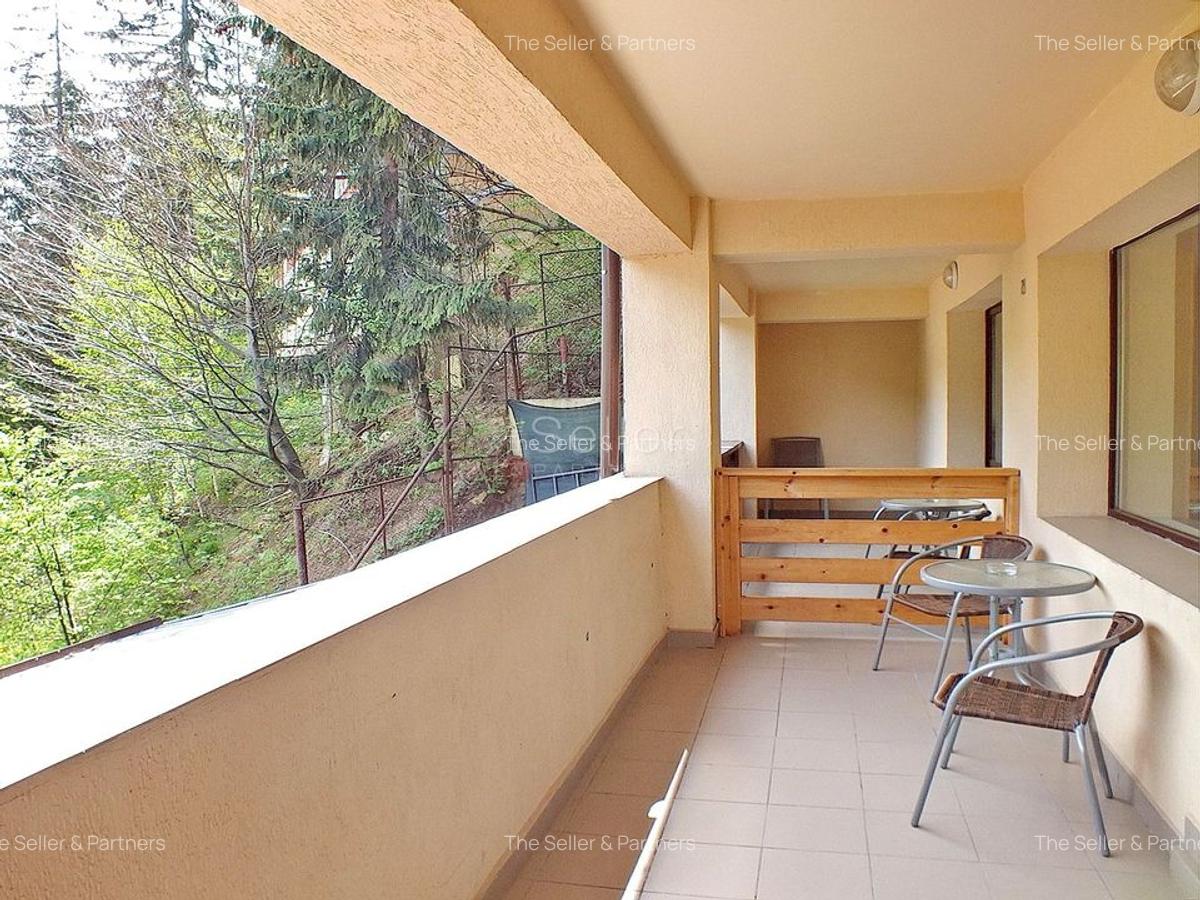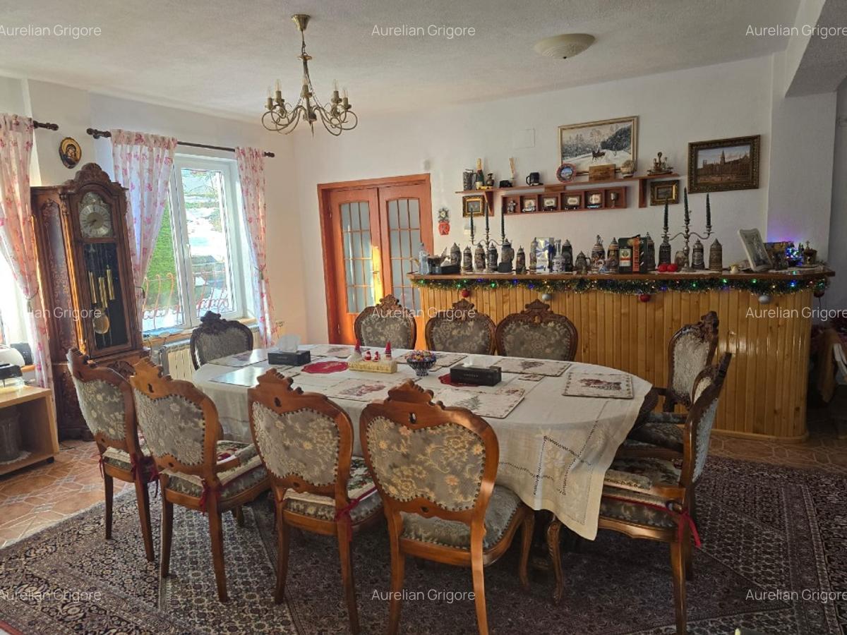 Clădirea include 13 camere cu băi proprii, multe dintre ele cu balcoane și priveliști fie către stațiune, fie către pădure, potrivit anunțului de vânzare publicat pe Imobiliare.ro.