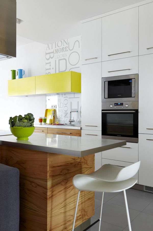 Elementul cromatic dominant în această amenajare este albul (de la pereți la piese de mobilier), accentuat de influxul masiv de lumină naturală ce pătrunde prin ferestrele mari; efectul acestei non-culori este temperat însă de prezența lemnului într-o nuanță deschisă, astfel că rezultatul este un ambient aerisit, luminos, dar cald și intim totodată. În plus, autorii proiectului apelează la accente îndrăznețe de culoare pentru a contura personalitatea locuinței: peretele parțial tapetat cu dungi verticale multicolore, petele de galben, albastru sau verde inserate prin intermediul a diferite piese de mobilier sau decorațiuni, toate acestea transmit dinamism și un entuziasm tineresc. La capitolul mobilier, varietatea formelor conferă locuinței un aer contemporan, cu înclinații spre eclectism.