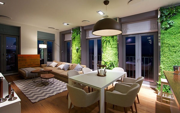 „Inima” casei este reprezentată de livingul spațios, cu bucătărie deschisă. Ferestrele înalte, ce înconjoară camera pe două laturi, asigură un influx masiv de lumină naturală pe timpul zilei, oferind totodată plăcerea unei panorame impresionante, chiar și (sau mai ales) după căderea întunericului. Avantajul suprafețelor vitrate generoase este potențat de mini-grădinile verticale amenajate pe pereții despărțitori, al căror verde luxuriant completează de minune atât peisajul de afară, cât și pe cel dinăuntru. Printre elementele ce realizează conexiunea cu natura la interior se numără și măsuța de cafea, realizată din două secțiuni transversale din trunchiuri de copac, utilizarea lemnului (sau a materialelor cu aspect de lemn), precum și paleta cromatică folosită de designeri (un mix de alb cu tonuri pământii, de maro și gri). Toate acestea se armonizează perfect cu mobilierul în stil modern, minimalist, precum și cu numeroasele corpuri de iluminat, ce dau un aer chiar avangardist întregului ambient.