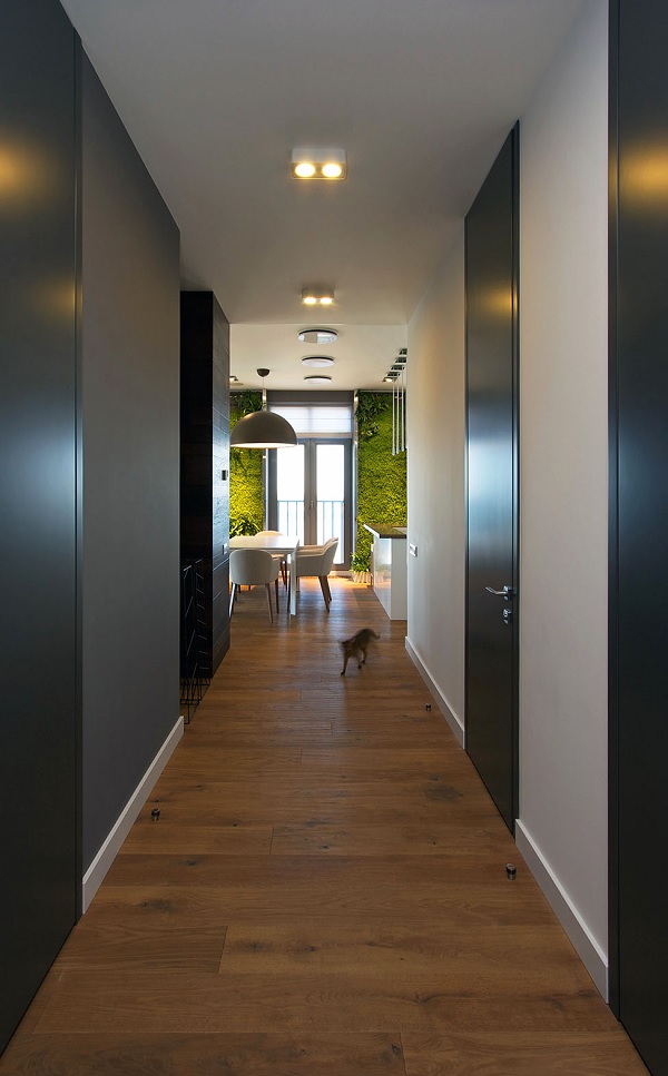 Situat într-un bloc cu vedere asupra râului Nipru din orașul Dnipropetrovsk, Ucraina, acest apartament a fost amenajat de biroul Svoya studio pentru o familie cu un copil. Designerii au reușit să pună perfect în valoare localizarea favorabilă a proprietății prin (re)crearea, la nivel simbolic, a unei strânse legături între natura perenă și stilul de viață contemporan, tipic urban, caracterizat de gustul pentru nou.