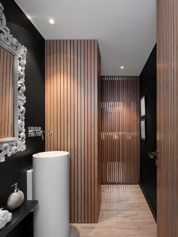 Elementul distinctiv al apartamentului este reprezentat de „culoarul” inversat – delimitat vizual, dar nu și fizic – ce unește toate încăperile casei. Astfel, din living până în camera de baie, pereții și tavanul sunt „îmbrăcați” în lemn lăcuit de-a lungul unui coridor imaginar. Efectul de fluidizare a spațiului este completat de faptul că diferitele zone ale locuinței nu sunt separate în mod tradițional. Nu doar că bucătăria comunică cu livingul, dar același lucru se poate spune și despre dormitor; în plus, zona de relaxare inclusă în mod obișnuit în baie (cada și dușul) sunt integrate aici în camera de odihnă, sporind astfel potențialul de relaxare al acesteia. O altă soluție interesantă de design constă în posibilitatea de a transforma cada într-o băncuță perfectă pentru citit, cu ajutorul unui capac rabatabil.