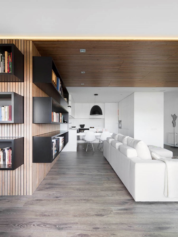 Locuința din imagini a fost amenajată pentru un cuplu pasionat de lectură din Barcelona. Conceptul de design, realizat de biroul Susanna Cots, a fost premiat la concursul internațional Idea Tops Awards (din China), la categoria Cel Mai Bun Apartament. „Cititul face parte din rutina zilnică a proprietarilor și, de aceea, zona centrală a casei este înconjurată transversal de rafturi pentru cărți. Biroul este, de asemenea, complet integrat în living, creând un colț inundat de lumină cu vedere spre terasă”, notează autorii proiectului.