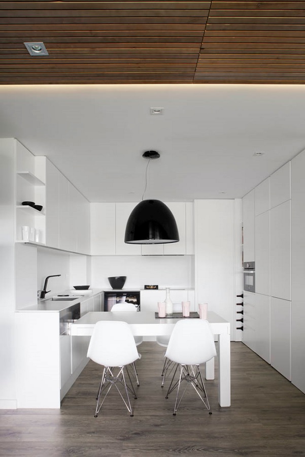 Din punct de vedere cromatic, amenajarea are la bază opoziția clasică dintre alb și negru, (non)culori ce se contopesc pe alocuri în tonuri de gri. Designerul creează astfel un fundal neutru, perfect pentru evidențierea „laitmotivului” întregului proiect – „culoarul” de lemn, ce conferă ambientului căldură și intimitate. „Ca în toate proiectele noastre, natura este un element esențial în design. În cazul acesta, terasa joacă un rol la fel de important ca restul elementelor de design”, completează autorii proiectului.