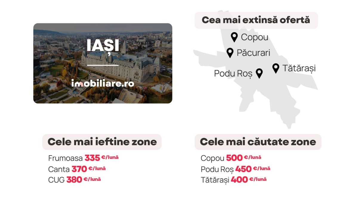 Cele mai multe apartamente de închiriat pot fi găsite în cartiere precum Tătărași (400 euro/lună), Copou (500 euro/lună), Podu Roș (450 euro/lună), Păcurari (400 euro/lună) sau Nicolina (400 euro/lună). Acestea sunt și unele dintre cele mai căutate zone din oraș în rândul potențialilor chiriași.