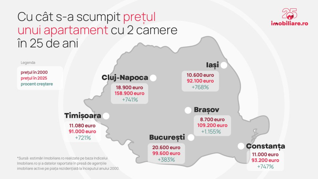 “Două decenii și jumătate au transformat profund piața imobiliară din România. Deși prețurile au crescut semnificativ față de anii 2000, accesibilitatea locuințelor a crescut datorită creșterii veniturilor populației, dar și creditării mai flexibilitate și la costuri mai mici. În același timp, cererea și oferta s-au schimbat radical, astăzi două treimi dintre cumpărători preferă apartamentele noi. În paralel, procesul de căutare a devenit complet digitalizat, ziarele de mică publicitate de altă dată devenind amintire”, a declarat Daniel Crainic, director de marketing Imobiliare.ro.