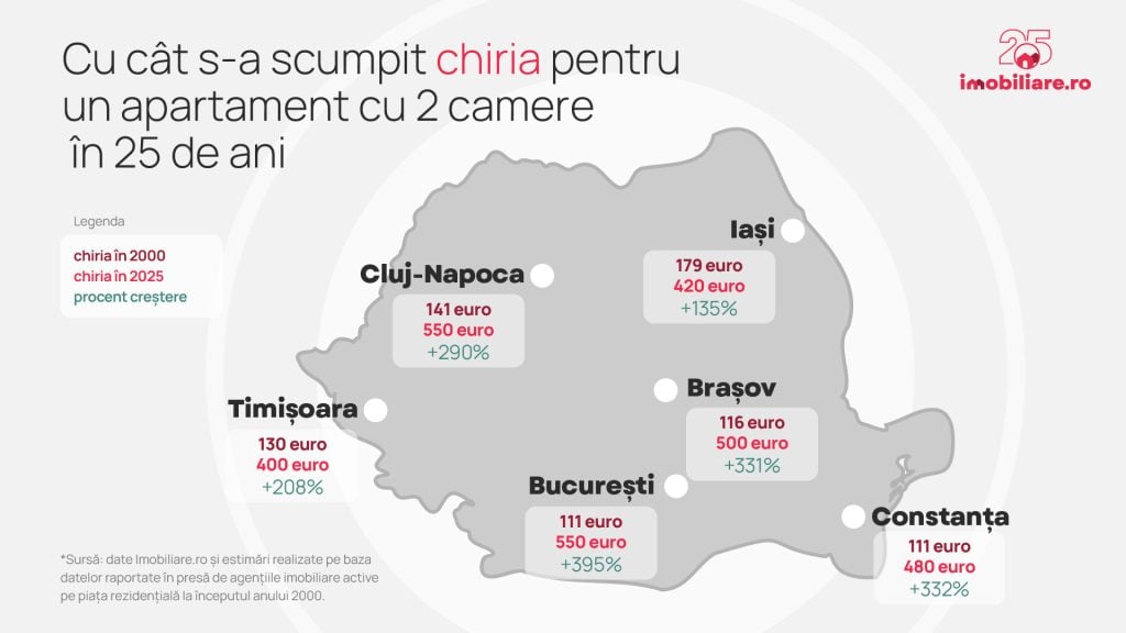 La începutul anului 2000, apartamentele cu 2 camere din Constanța se închiriau cu sume similare cu cele solicitate în București. Dacă estimăm că media înregistrată la nivelul pieței era de 111 euro/lună, putem spune că proprietarii au majorat chiriile cu 332% în ultimii 25 de ani.