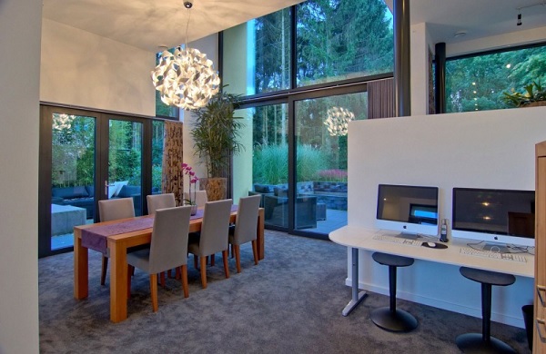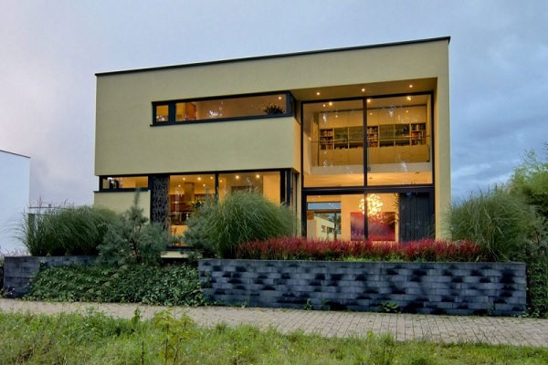 Un alt element constructiv specific modern constă în integrarea în proiect a unor suprafețe vitrate de mari dimensiuni – în special în zona socială a casei, restul camerelor fiind mai bine „protejate” vizual. Se pune astfel accent pe comunicarea dintre spațiul interior și cel exterior, dintre om și natură, legătură pe care arhitecții contemporani încearcă atât de mult să o restabilească. „Forma rezultată propune un dialog între nivele și goluri diferite, folosind lumina pentru a atrage către sau a se reflecta din diferite suprafețe, ceea ce permite o citire diferită a spațiului și volumelor în timpul zilei”, explică autorii proiectului, arhitecții de la biroul danez CKX architecten.
