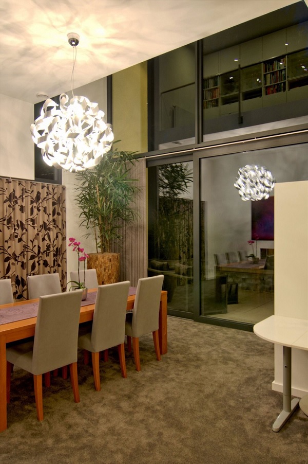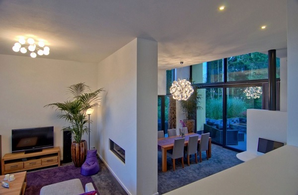 Ca și arhitectura, amenajarea casei este tipic modernă – aceasta fiind perfect pusă în valoare de „valurile” de lumină naturală din timpul zilei și de panorama oferită de curtea perfect întreținută a proprietății. Din combinația lemnului cu texturi fine (în nuanțe deschise de gri), dinamizată pe alocuri de accente de violet sau roz aprins, rezultă o atmosferă caldă, intimă, de familie. Plantele naturale completează acest ambient armonios, confortabil și primitor.