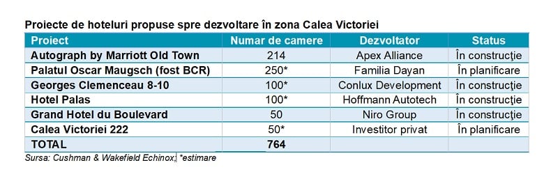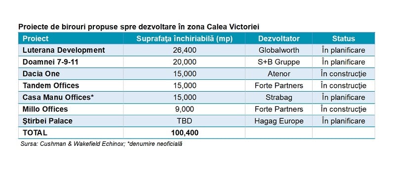 Potrivit reprezentanților companiei de consultanţă imobiliară Cushman & Wakefield Echinox, zona Calea Victoriei din București va continua să se dezvolte ca pol de birouri și hotelier în următorii ani. Astfel, planurile dezvoltatorilor vizează ridicarea a șapte noi clădiri de birouri, dar și a șase hoteluri pe artera cu o lungime de 2,8 kilometri situată între Piața Victoriei și Piața Națiunile Unite. Valoarea investițiilor în acest proiecte poate depăși, potrivit estimărilor, pragul de 300 de milioane de euro.