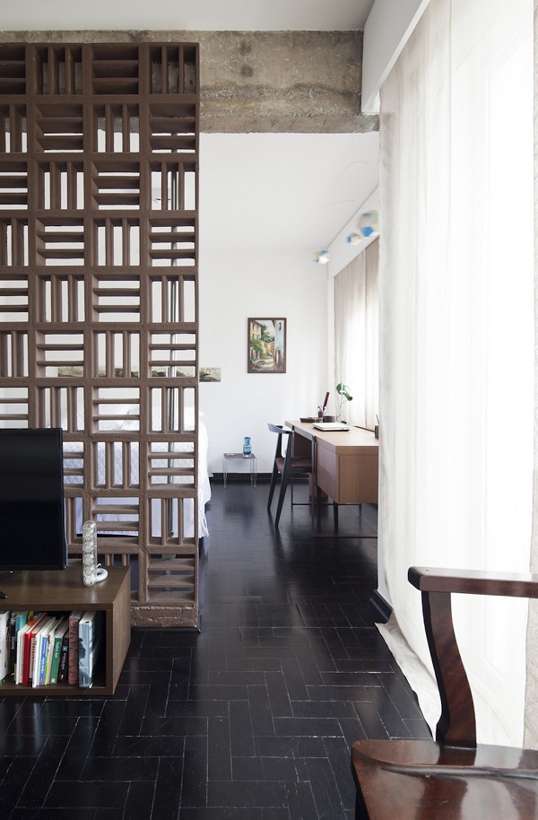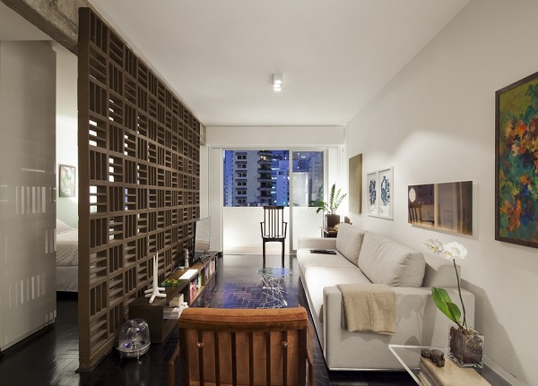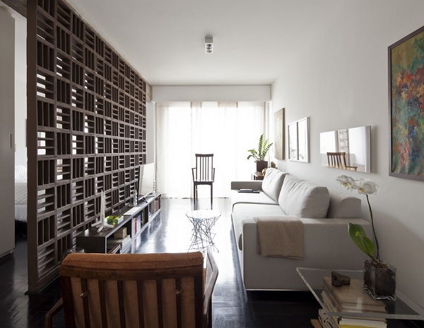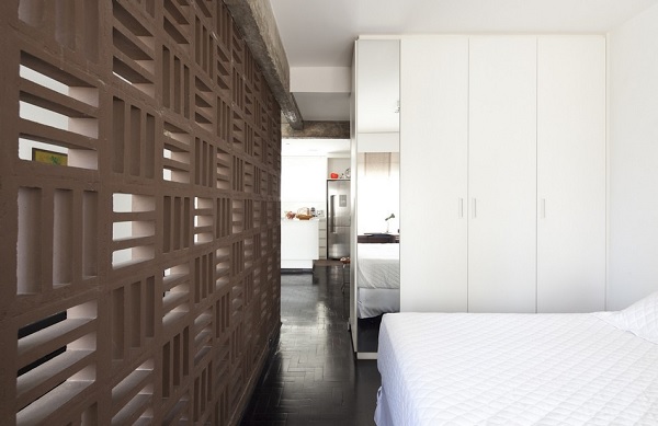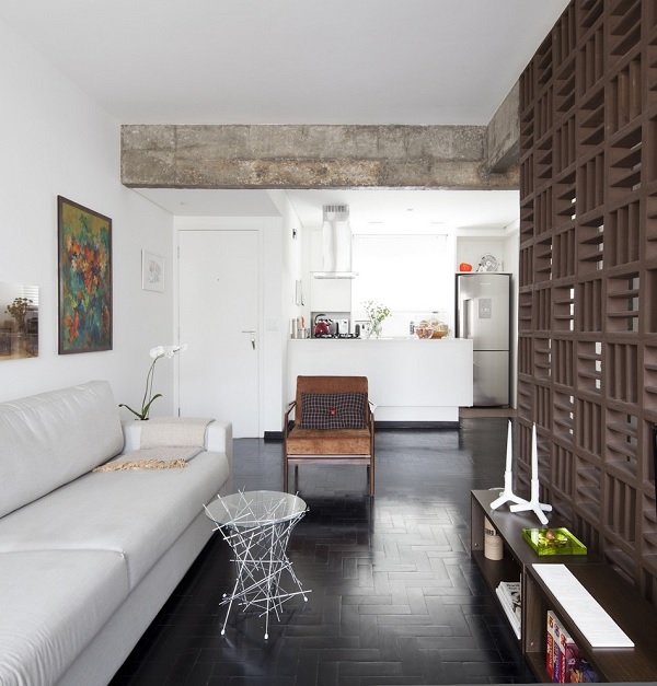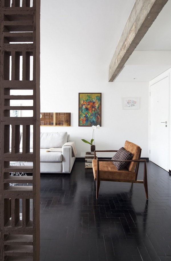 Pentru a ajunge să arate astfel, proprietatea a trecut printr-o serie de schimbări. În primul rând, pereții despărțitori dintre camere au fost înlăturați, ca expresie a unei tendințe moderne în designul interior, respectiv accentuarea „fluidității” spațiului. O altă modificare importantă implementată de autorii proiectului este că grinzile din beton, parte a structurii de rezistență a blocului, au fost expuse vederii – fapt ce conferă ambientului un aspect nefinisat, cu accente industriale. Un alt element ce contribuie din plin la conturarea caracterului modern al acestei locuințe este reprezentat de peretele de beton „perforat” ce separă livingul de dormitor; acesta este realizat din cărămizi numite „cobogo”, reprezentative pentru arhitectura modernistă braziliană de la începutul secolului XX.