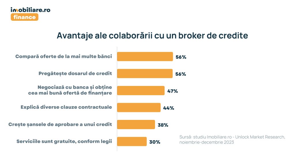 Două dintre cele mai importante aspecte de care pot beneficia cei care colaborează cu un broker de credite sunt, conform unui studiu realizat de Imobiliare.ro și compania de cercetare de piață Unlock Market Research, sprijinul obținut în pregătirea dosarului de credit și oportunitatea de a compara oferte venite din parte mai multor bănci.