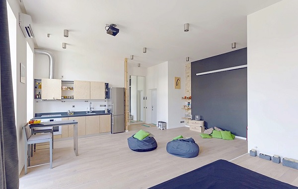 Amplasat într-un bloc vechi din Kiev, Ucraina, apartamentul din imagini este perfect similar celor construite în perioada comunistă (și) în România. La o suprafață utilă de 58,5 metri pătrați, locuința avea inițial o compartimentare clasică, fiind compusă din două camere. Conceptul de (re)amenajare propus de designerul Dan Vakhramieiev este însă unul modern, neconvențional, și se potrivește perfect nevoilor unei persoane care locuiește singură – sau, de ce nu, ale unui cuplu tânăr.