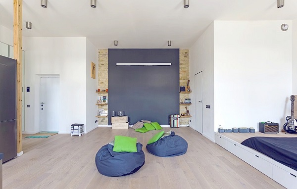 O altă caracteristică a stilului modern, ce poate fi observată și în cazul acestui proiect, este înclinația vizibilă către minimalism – obiectele masive de mobilier sunt înlocuite cu câteva (nu prea multe!) elemente moderne, simple, ușor de manevrat și cu un pronunțat caracter funcțional. Astfel, combinația clasică de canapea cu fotolii din living este dată la o parte de două fotolii tip „puf”, alături de câteva perne împrăștiate pe podea; patul masiv devine o simplă saltea așezată pe podeaua supraînălțată a „dormitorului”; dulapurile greoaie dispar cu totul din „peisaj”, fiind înlocuite de spații de depozitare ascunse (un dressing separat, sertare în spațiul de sub pat) și de câteva polițe pe pereți, pentru decorațiuni.