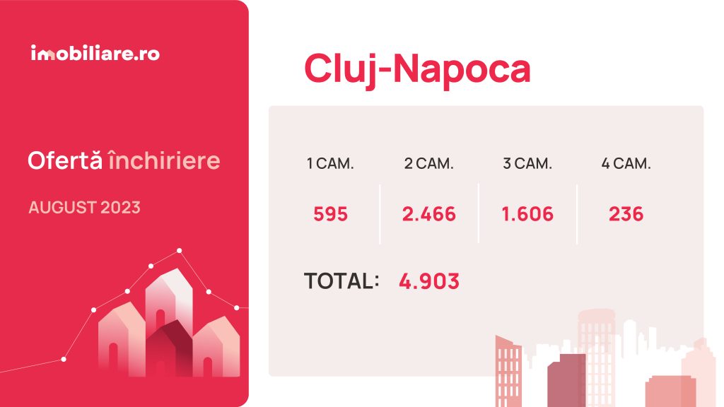 Doar 595 de garsoniere puteau fi închiriate în Cluj-Napoca la sfârșitul lunii august, reprezentând 12% din oferta totală de pe plan local. Pe acest tip de locuințe s-a înregistrat cea mai importantă depreciere a ofertei, numărul garsonierelor disponibile reducându-se cu aproape 40% față de august 2022.