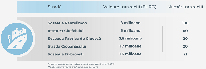 Primul loc în top este ocupat de Șoseaua Pantelimon unde în perioada menționată au fost încheiate 100 de tranzacții cu locuințe situate în imobile construite după anul 2000, conform datelor Primăriei Sectorului 2, centralizate de Analize Imobiliare și prezentate în cadrul emisiunii imoExpert. Valoarea totală a tranzacțiilor a atins în acest caz 8 milioane de euro.