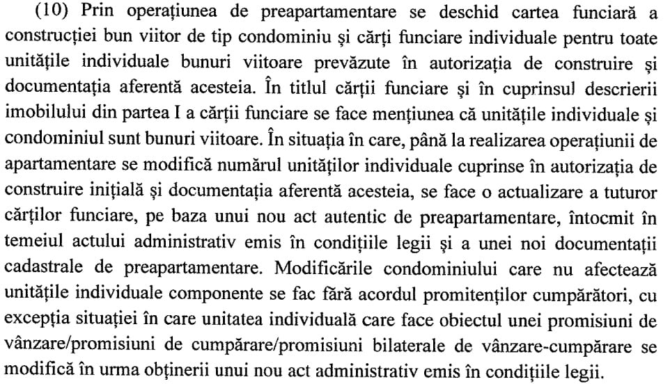 „Operațiunea de preapartamentare a construcției de tip condominiu bun viitor în unități individuale bunuri viitoare se face în baza actului autentic de preapartamentare, întocmit potrivit documentației cadastrale de preapartamentare recepționată de oficiul teritorial. Documentația cadastrală de preapartamentare se întocmește de persoana fizică sau juridică autorizată pentru executarea lucrărilor de specialitate, pe baza autorizației de construire și a documentației aferente acesteia”, explică textul legii.