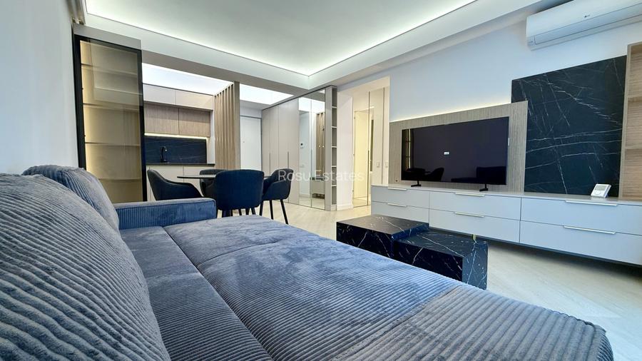 Imobilul are suprafata de 50 mp utili, este complet mobilat și echipat, având o compartimentare inteligentă a spațiilor. Dormitorul dispune de un pat matrimonial de 1.60x2m, dressing incapator de sus pana jos, comoda cu dulapuri, plus spatiu pentru depozitare sub pat. Bucătăria este open space si este complet utilata: masina de spalat vase, cuptor, frigider si congelator incorporate, aragaz, cuptor cu microunde. La intrarea in apartament este un spatiu cu bancuta, cuier si pantofar, iar pe peretele opus este amenajat un dressing incapator pentru pantofi. Intre living si baie regasim un alt spatiu pentru depozitare unde se afla si masina de spalat rufe care are uscator integrat. Apartamentul beneficiaza de TV LG Smart atat in living cat si in dormitor.