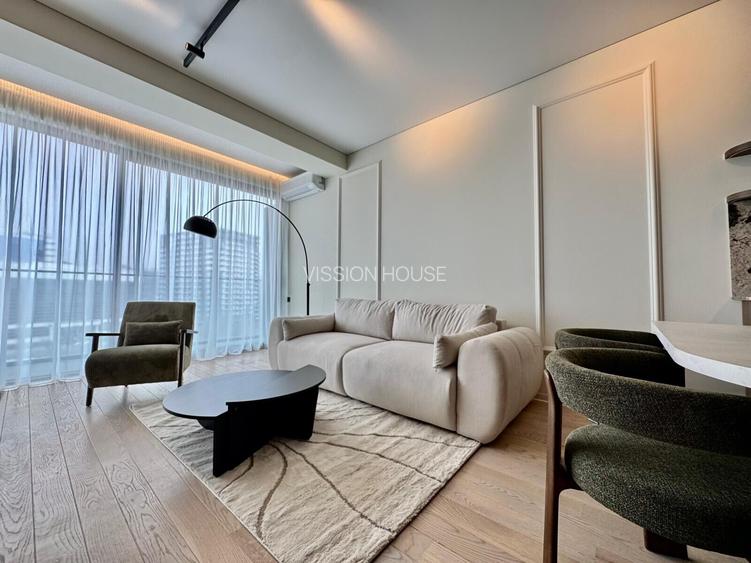 Spațiul este gândit pentru confort și rafinament: mobilier personalizat, finisaje premium, accente calde și o lumină ambientală perfect echilibrată. Livingul elegant se deschide către o terasă spațioasă cu priveliște panoramică, iar bucătăria este complet echipată cu electrocasnice de top, integrate discret în mobilierul realizat la comandă.