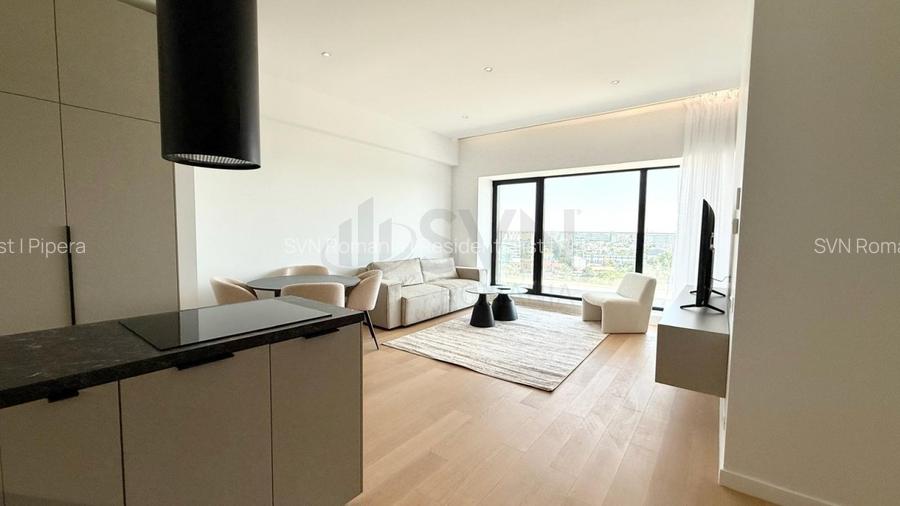 Apartamentul este complet mobilat si utilat, beneficiind de finisaje premium si electrocasnice de ultima generatie. Bucataria este echipata cu plita cu inductie, cuptor, masina de spalat vase, masina de spalat rufe cu uscator si frigider. Confortul termic este asigurat prin incalzire in pardoseala si sistem de aer conditionat.