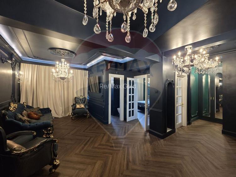 Livingul și dormitorul, decorate în tonuri profunde și regale, sunt animate de candelabre de cristal, mobilier baroc și finisaje premium, care creează o atmosferă aristocratică. Este apartamentul perfect pentru cei care caută mai mult decât confort – caută un stil de viață.