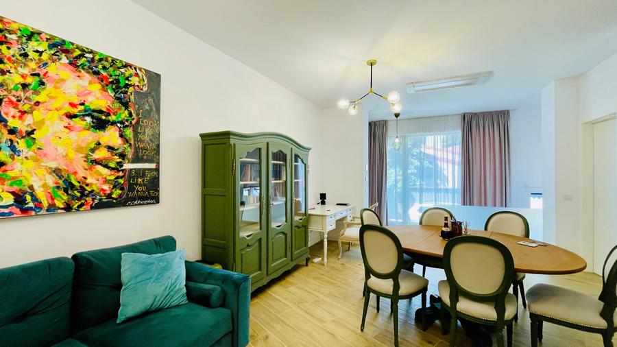 Apartamentul este situat la parterul unui bloc boutique de 5 etaje construit in 2023 si se inchiriaza complet mobilat si utilat.