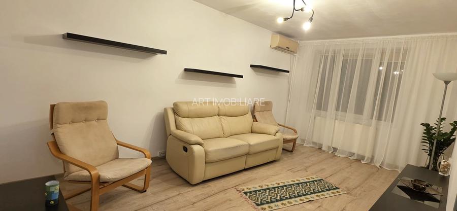 Apartamentul a fost renovat, are 1 baie cu geam, este mobilat, bucataria este deschisa a fost extinsa in balcon si este utilata cu: plita pe gaz, cuptor electric, hota frigider, masina de spalat rufe. Centrala proprie, aer conditionat, ferestre cu geam termopan, usa metalica. Vor fi montate perdele, draperii, televizoare, perne balansoare si mici reparatii. Orientare Sud - Est.