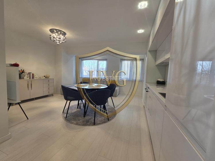 Apartamentul dispune de loc de parcare subteran inclus și este amenajat cu finisaje premium și mobilier modern. Compartimentarea este eficientă, incluzând un dressing separat și multiple spații de depozitare.