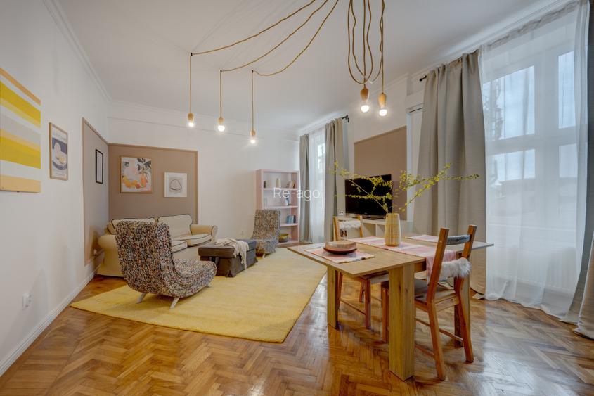 Apartamentul este situat la etajul 1 al cladiri, cu o suprafata construita de 60 mp si utila de 50 mp, apartamentul are o compartimentare semidecomandata cu bucataria open space, este renovat integral si beneficiaza de centrala proprie.