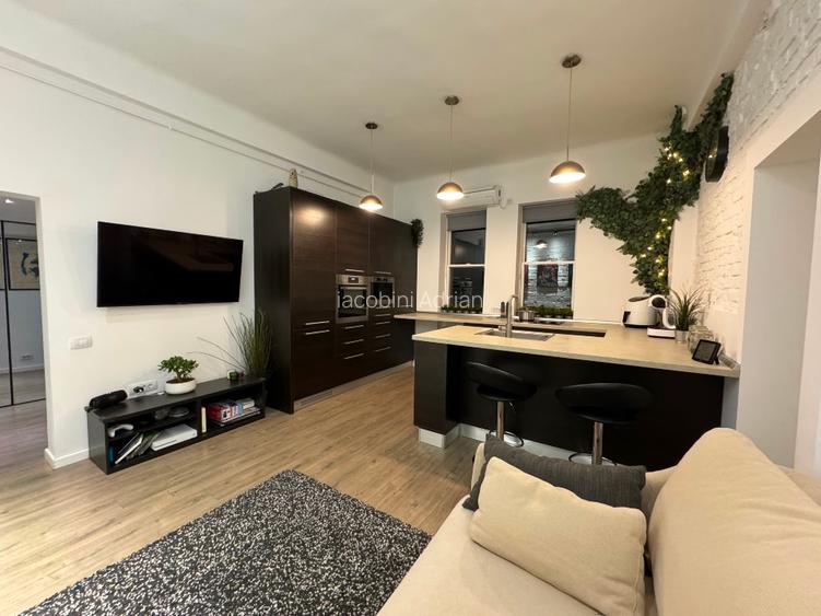 Apartament de 2 camere, cu o suprafață de 42mp, situat într-una din cele mai frumoase și emblematice clădiri din București, în Piața Alexandru Lahovari 1a ce a fost complet renovat (șapă nouă cu izolație termică, electrică nouă, țevile pentru sanitare și căldură de asemenea schimbate, dotat cu aer condiționat Samsung în fiecare cameră, mașina de spălat cu uscător, mașina de spălat vase și toate electrocasnicele A+, iluminat smart), filtru de apă cu purificator și osmoză, mobilier Ikea.