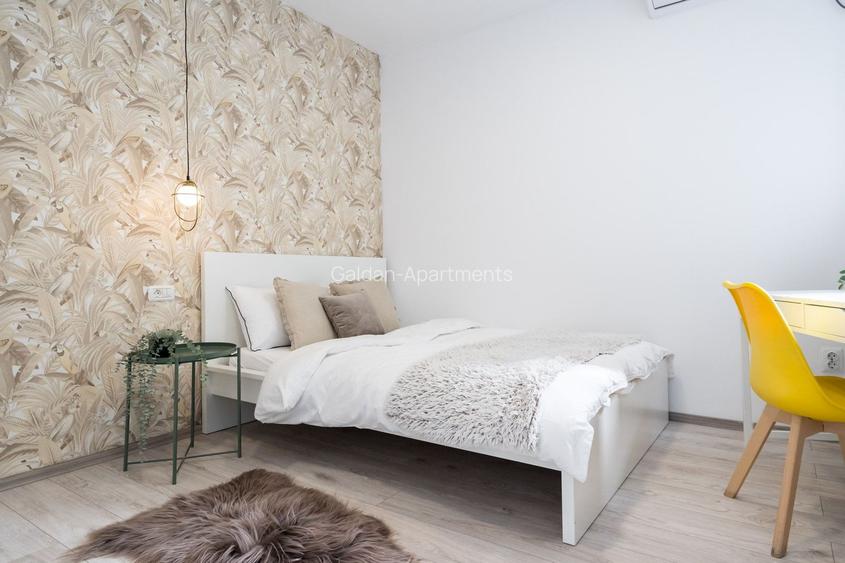 Locuința este compusă din două camere complet mobilate, amenajate cu atenție la detalii, incluzând o zonă de birou practică și spații de depozitare. Bucătăria este deschisă și complet echipată cu toate electrocasnicele necesare. Baia dispune de fereastră pentru ventilație naturală, iar balconul închis oferă un spațiu suplimentar generos, ideal pentru relaxare.