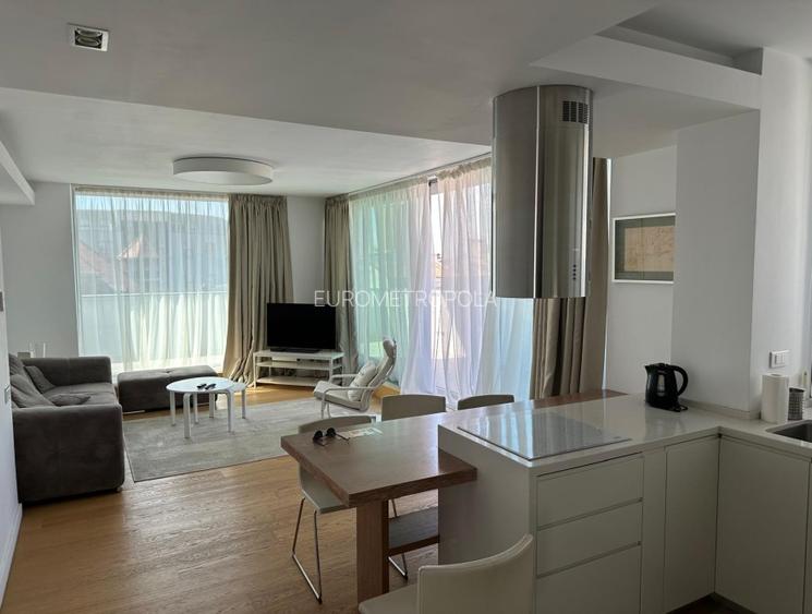 Eurometropola va oferă spre inchiriere un penthouse elegant cu 3 camere decomandat, dispus pe o suprafata utila de cca 110mp + 2 terase de cca 60mp, mobilat si utilat gama premium , smart home, 2 grupuri sanitare, sala sport, 1 loc parcare subteran.