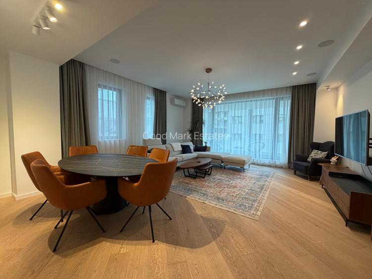 Apartament premium cu 4 camere (living, 2 dormitoare și birou/cameră de oaspeți), mobilat și utilat, situat la etajul 2 al unui bloc nou. Apartamentul este compus din living spațios cu zonă de dining și acces pe terasă, bucătărie închisă, complet echipată și utilată, grup sanitar pentru oaspeți, cameră separată pentru spălătorie, dormitor matrimonial cu baie proprie, dormitor secundar și birou / cameră de oaspeți deservite de a treia baie, precum și a doua terasă. Beneficiază de 2 locuri de parcare în subteran.