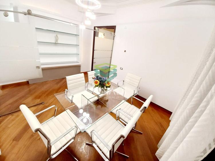 Spațiul este compartimentat eficient, cu 4 camere mari și luminoase, hol generos ce poate fi recepție, chicinetă și grup sanitar. Înălțimea camerelor și finisajele de calitate conferă un aer elegant și profesional. Confortul termic este asigurat de centrala proprie si aparate de A/C.