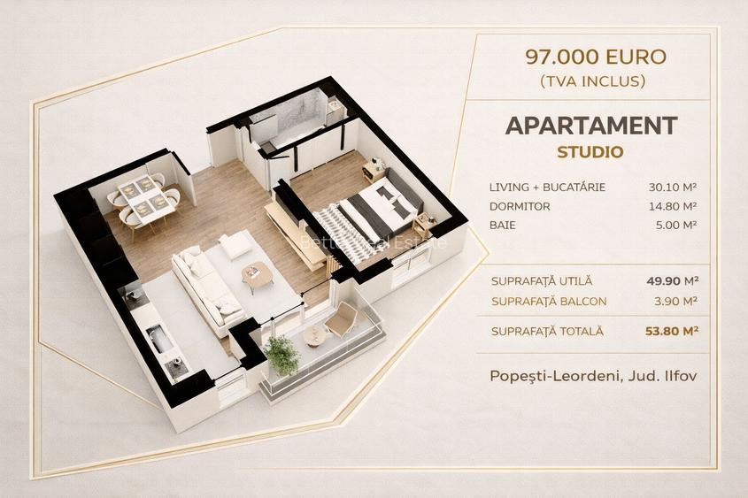 Studio spațios 54 mp | Etaj intermediar | Alegere finisaje | Direct dezvoltator