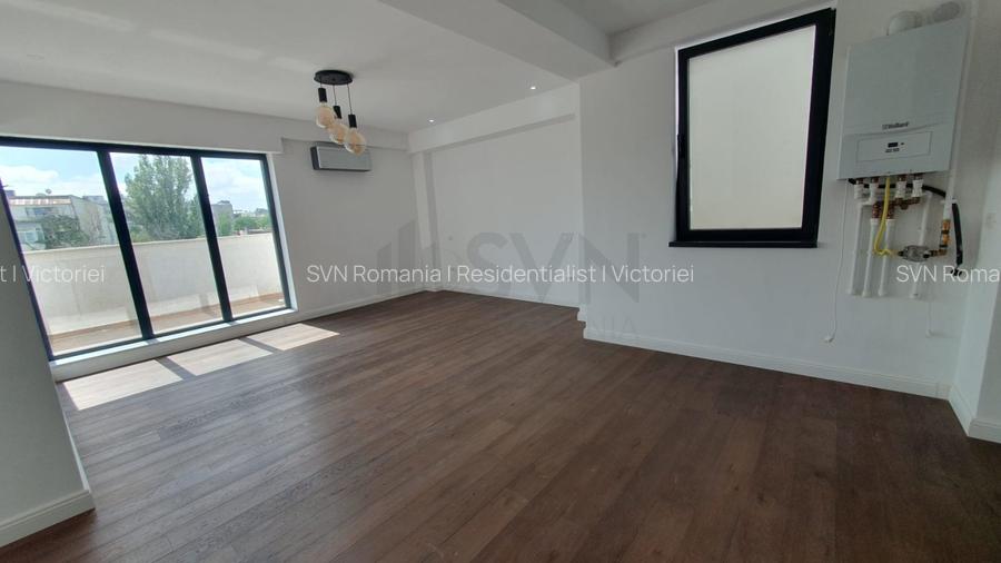 Penthouse-ul este dotat cu doua bai complet echipate, un grup sanitar de serviciu si o baie mare atasata dormitorului matrimonial, care include si un dressing spatios. Livingul de tip open space se deschide catre o terasa generoasa, perfecta pentru relaxare sau divertisment.