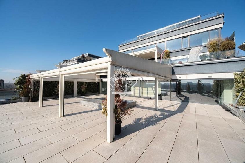 Terasă: 165 mp cu pergolă retractabilă de 100 mp și senzori de vânt, jardiere laterale pentru intimitate cu vecinii, înalte de 2,5 m cu sistem automat de aspensoare, dus solar, pardoseala flotanta, lumini ambientale. Orientare spre sud.