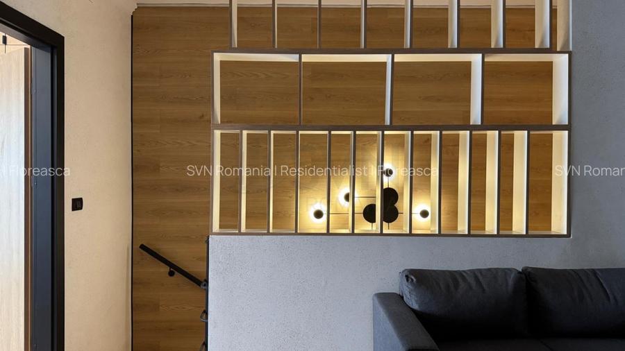 Parterul este configurat functional si modern, incluzand zona de living cu spatiu dedicat TV, hol de acces, grup sanitar de serviciu echipat cu vas WC cu bideu incorporat, precum si o bucatarie complet mobilata si utilata, dotata cu frigider incorporabil cu latime de 70 cm, masina de spalat vase, plita cu inductie, hota automata si multiple spatii de depozitare. Bucataria poate fi complet separata de zona de zi prin intermediul usilor culisante. Accesul catre terasa acoperita de 12 mp se realizeaza direct din zona de living.