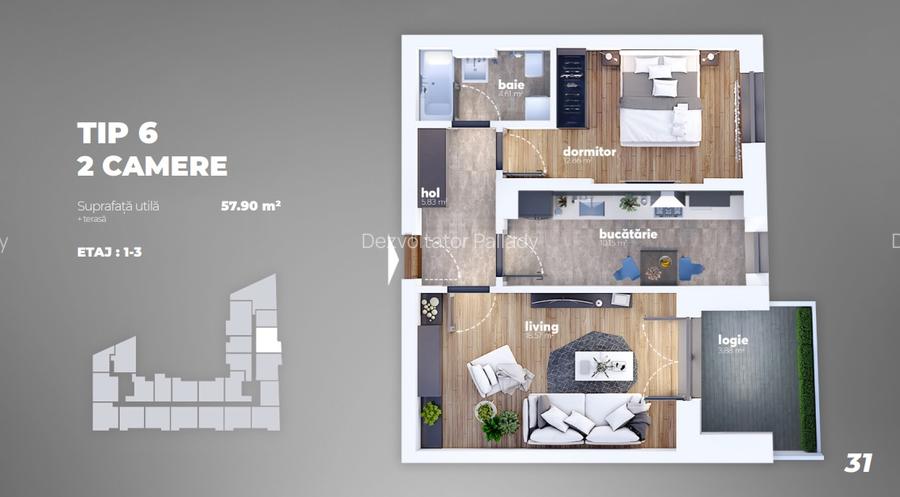 Pret valabil pentru avans de 95%.Pentru avans de 15% pretul este de 94.500 euro+tva